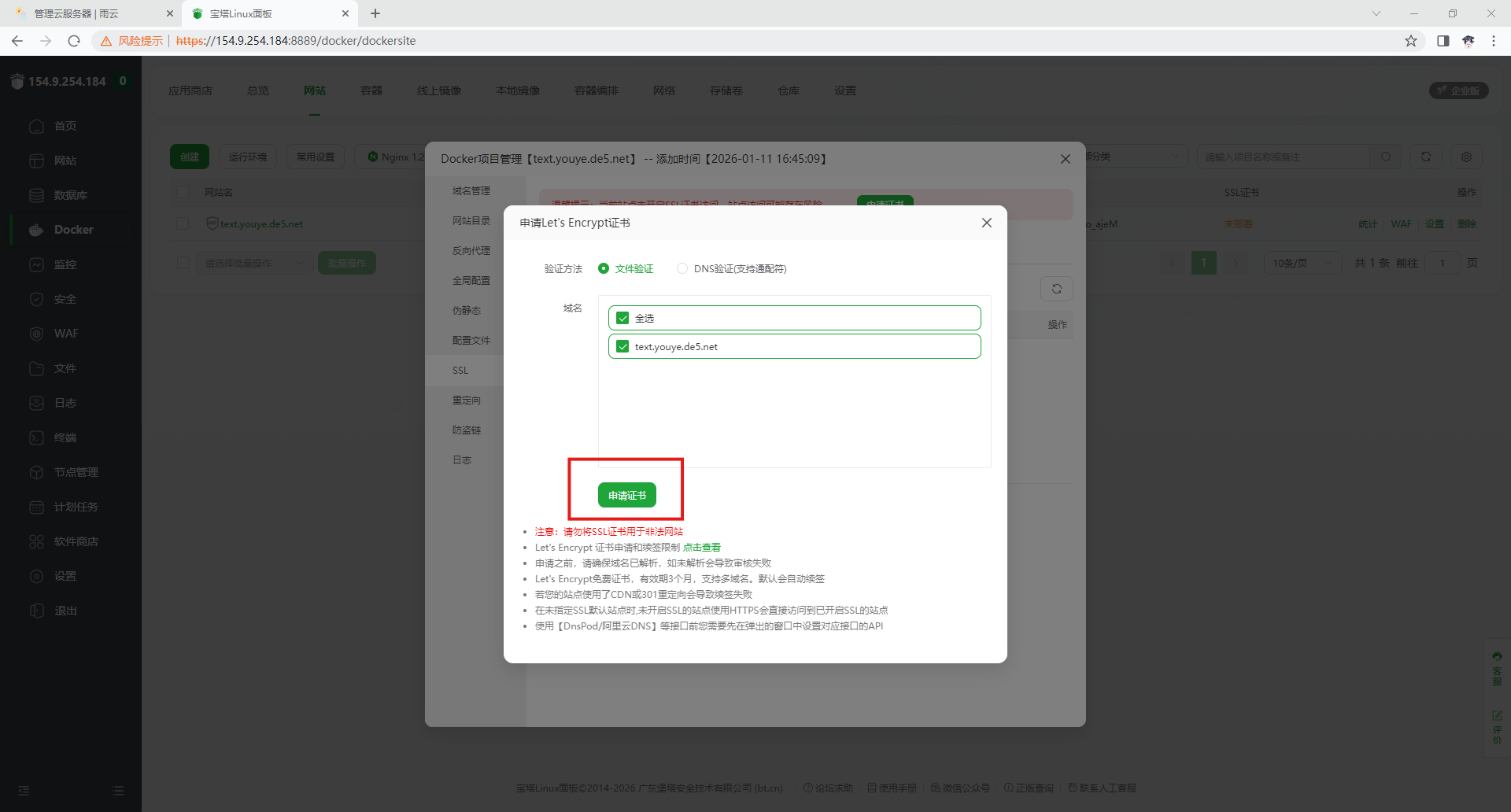 在弹出的窗口选择“Let's Encrypt”,然后点击“申请证书”