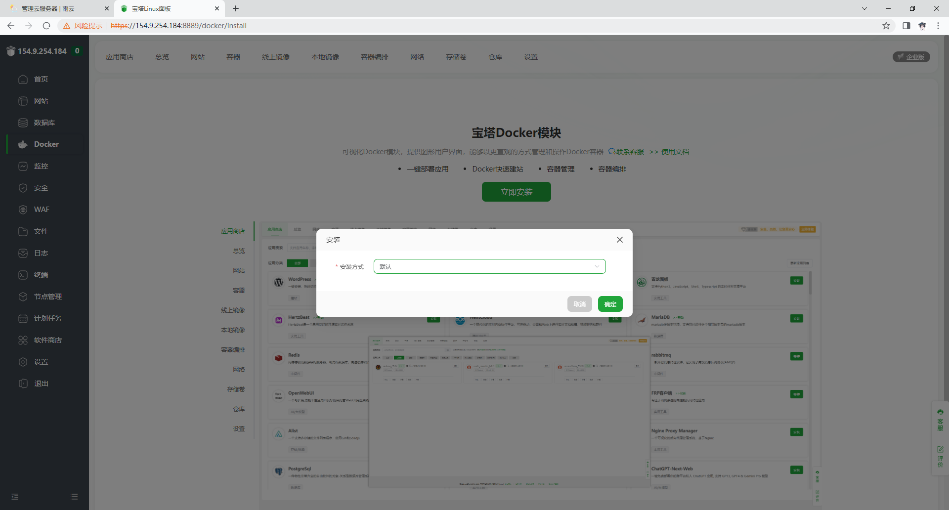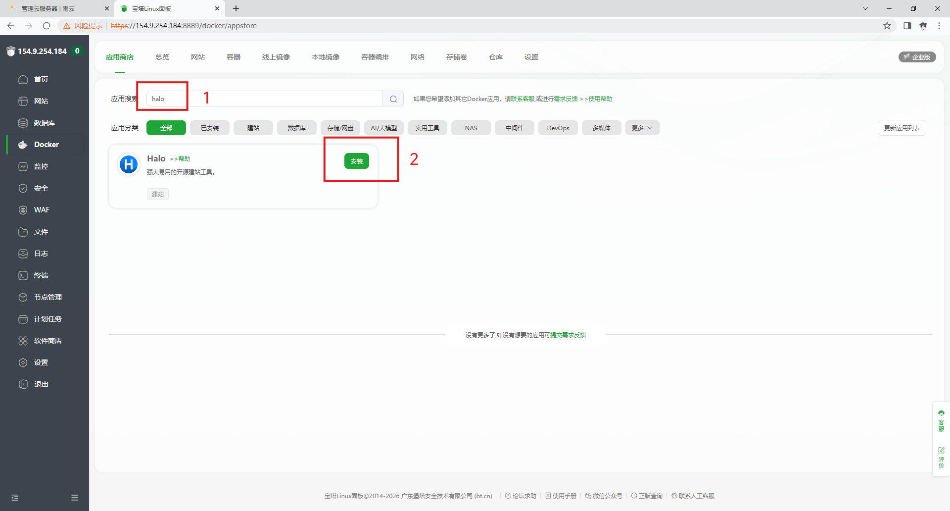 进入服务器管理页面,点击左上“宝塔管理面板”进入宝塔