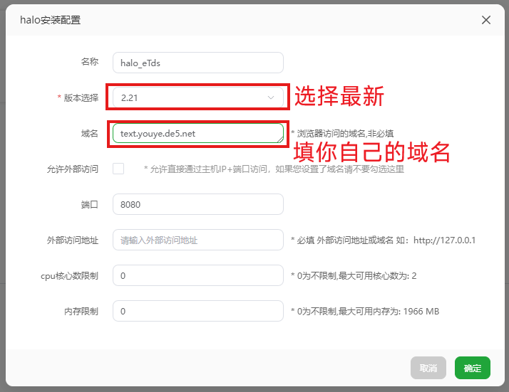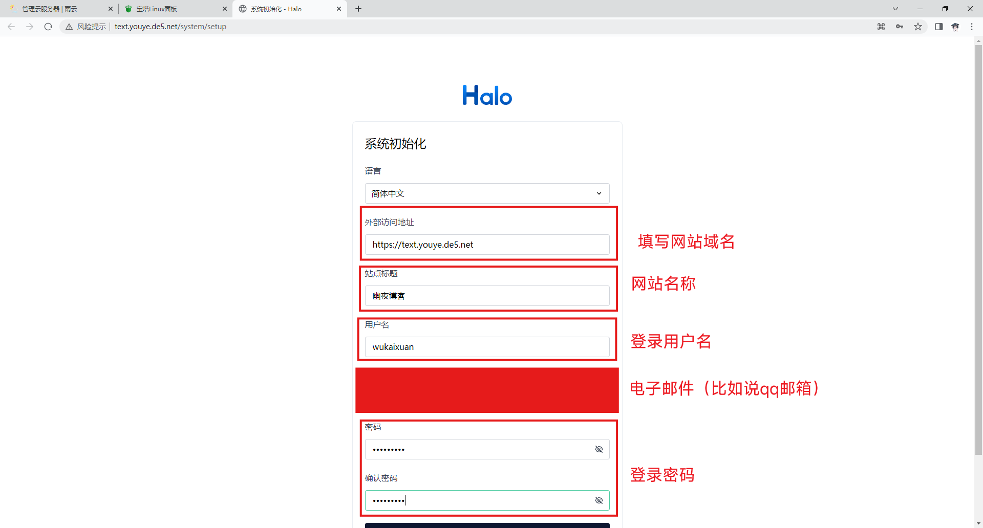按照如下填写(域名填你自己的),然后点击确定,等待安装