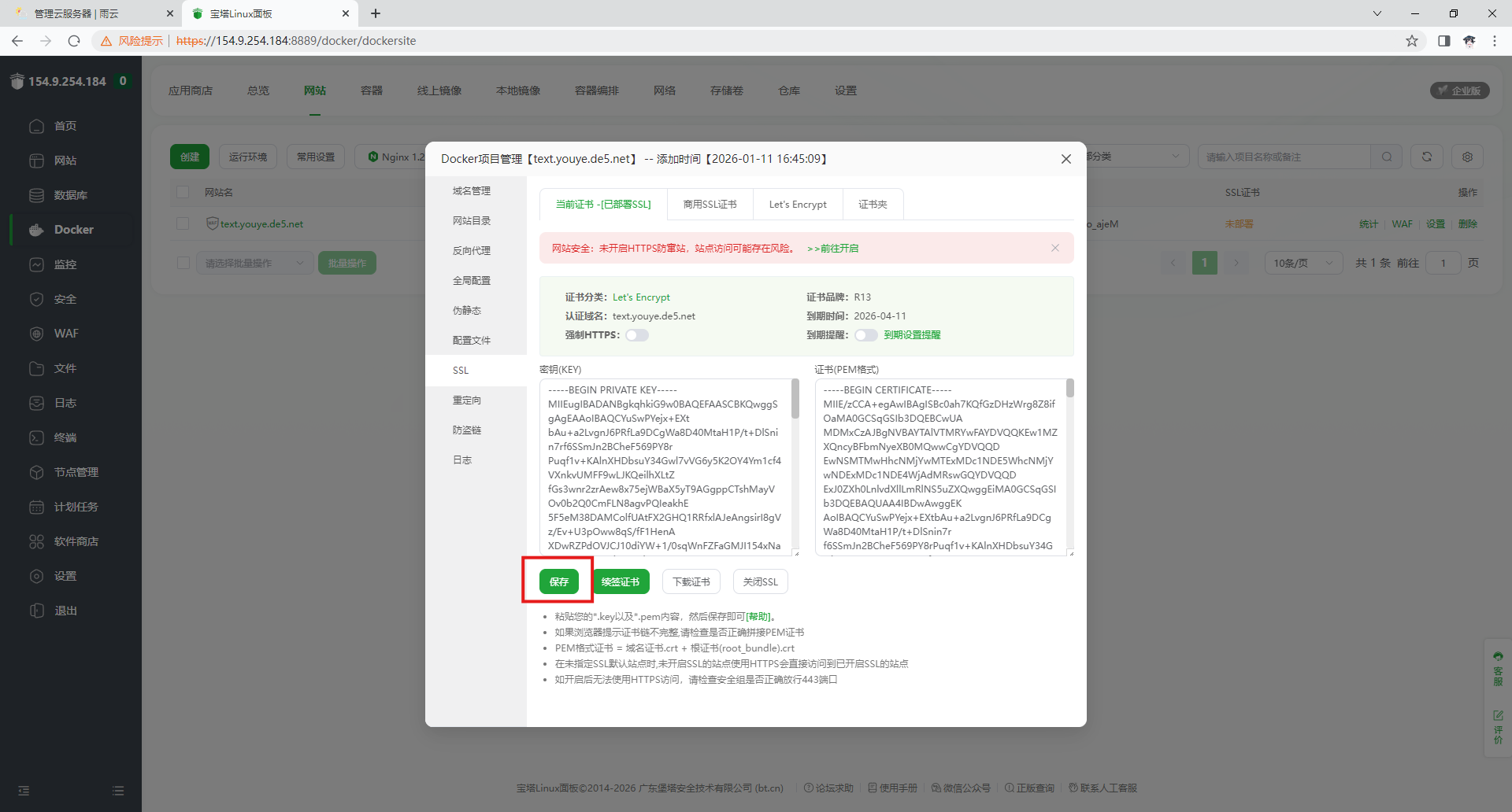 回到您的宝塔面板,点击上列网站,找到您刚刚创建的网站,点击右侧SSL证书下的未部署