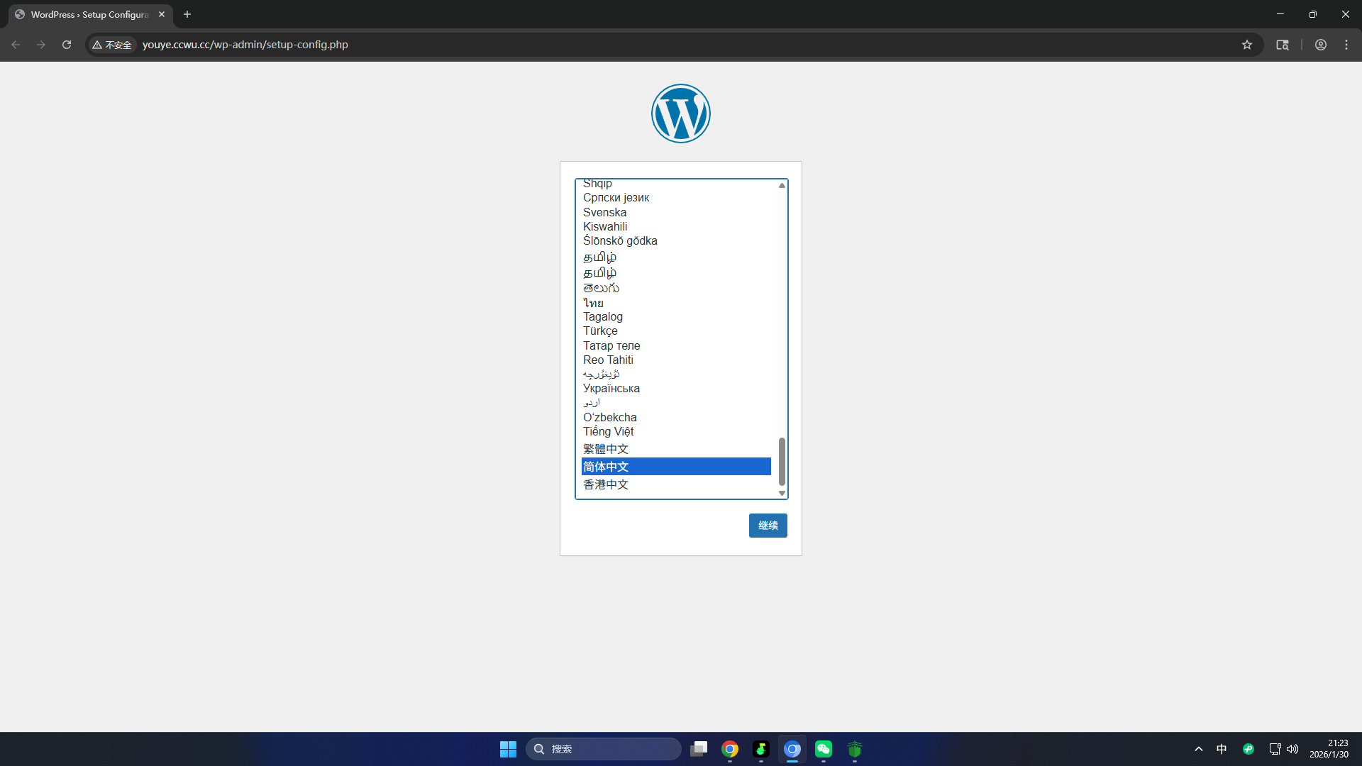 在选择语言页面下拉选择简体中文,然后点击继续