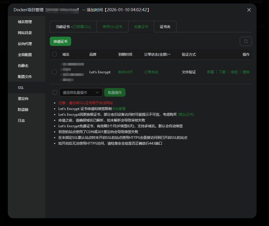 Docker部署方式:Docker>网站>SSL证书
