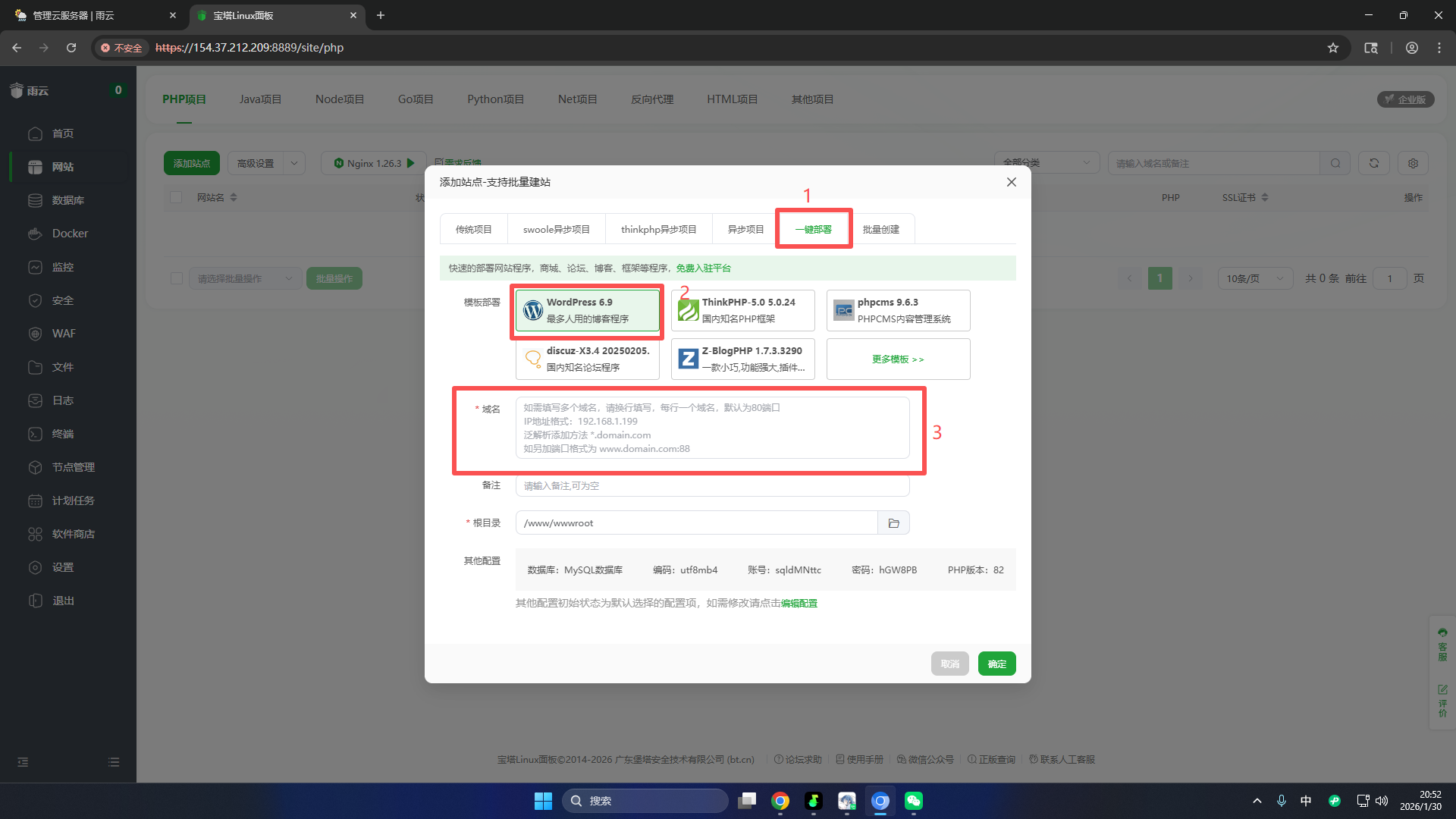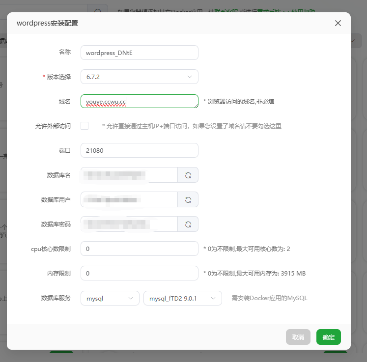 WordPress其他默认,域名填你外部访问的域名(前提是要安装Nginx,雨云提供的宝塔默认已经安装)