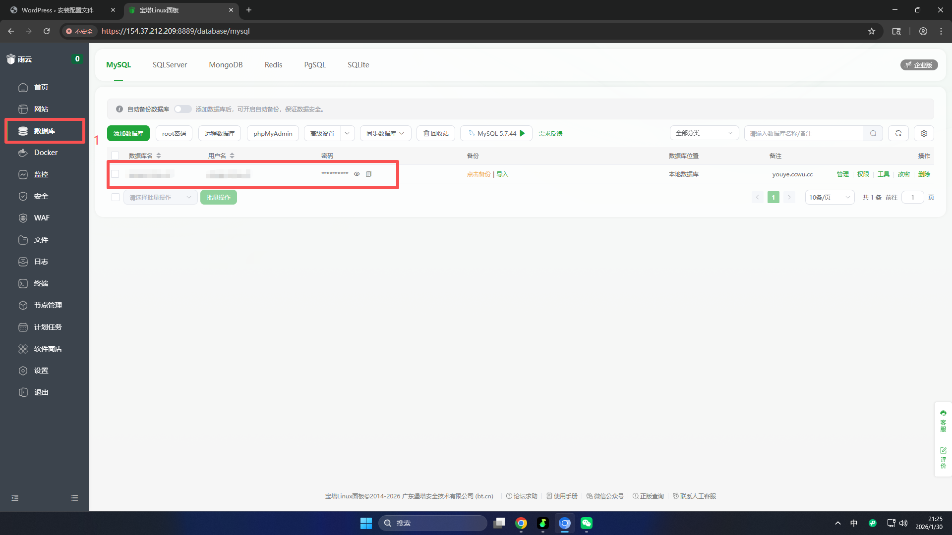 回到宝塔面板,点击左侧数据库,然后复制数据库名、用户名和密码