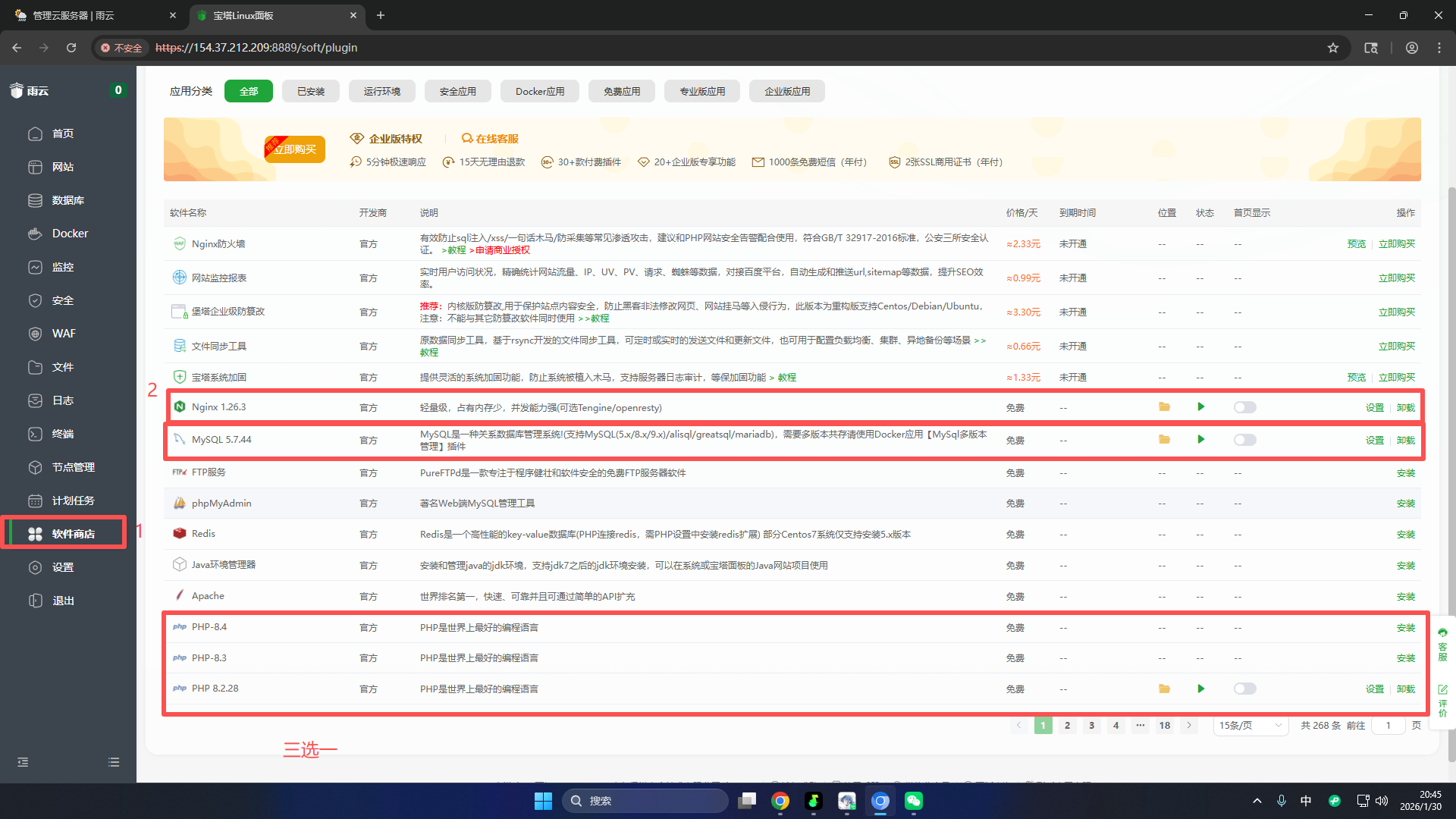 点击左侧软件商店,在页面下滑安装Nginx、MySQL和PHP(任意一个版本)这仨玩楞
