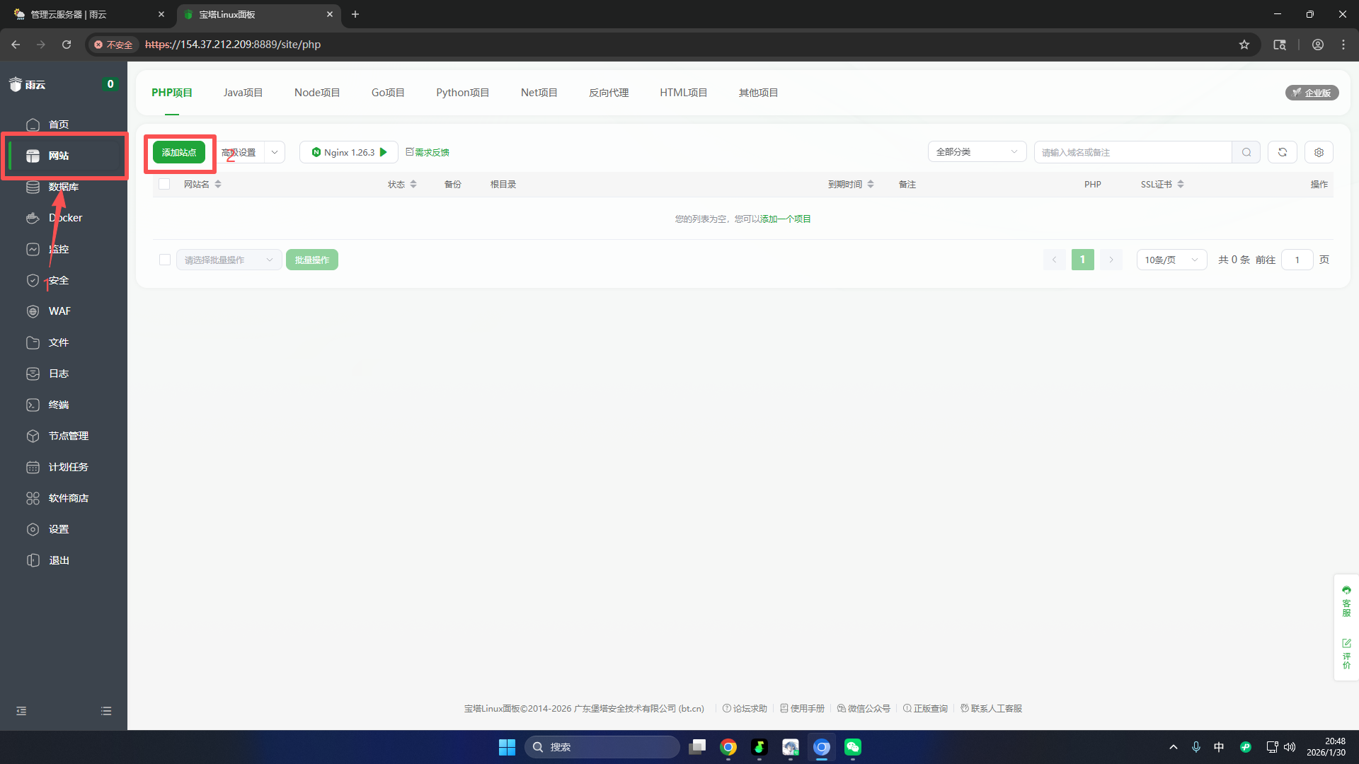 等待安装完成后点击左侧网站,然后点击页面左上添加站点