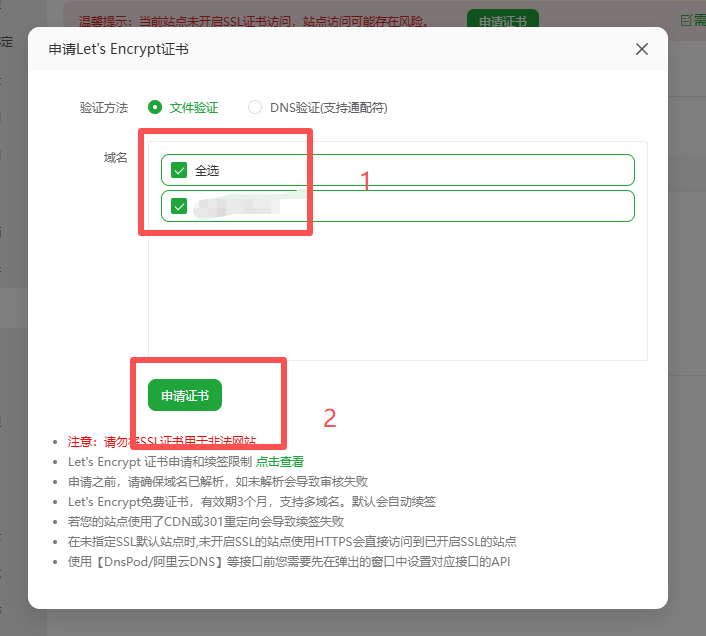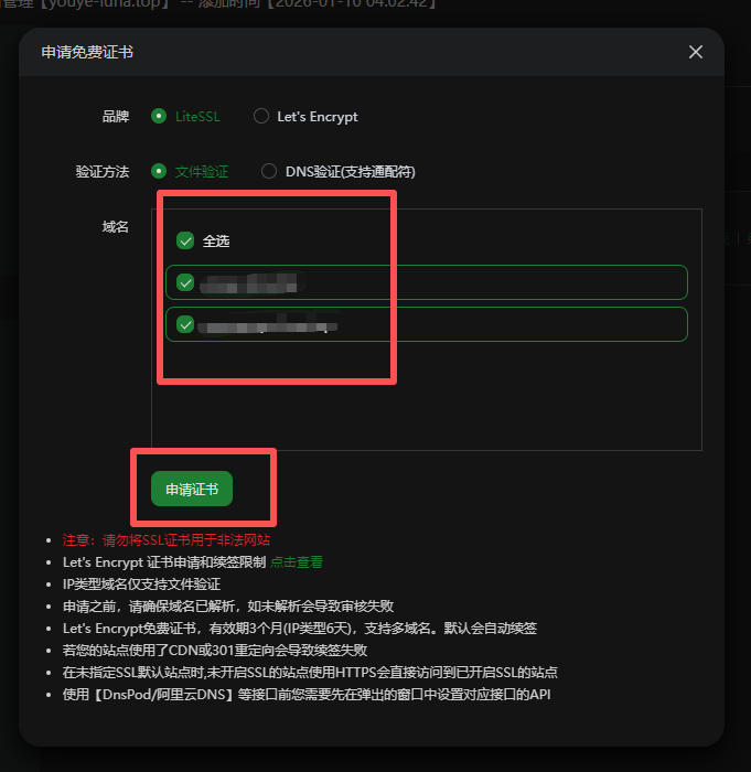 在弹出窗口单击勾选选择要申请的域名,然后点击申请证书