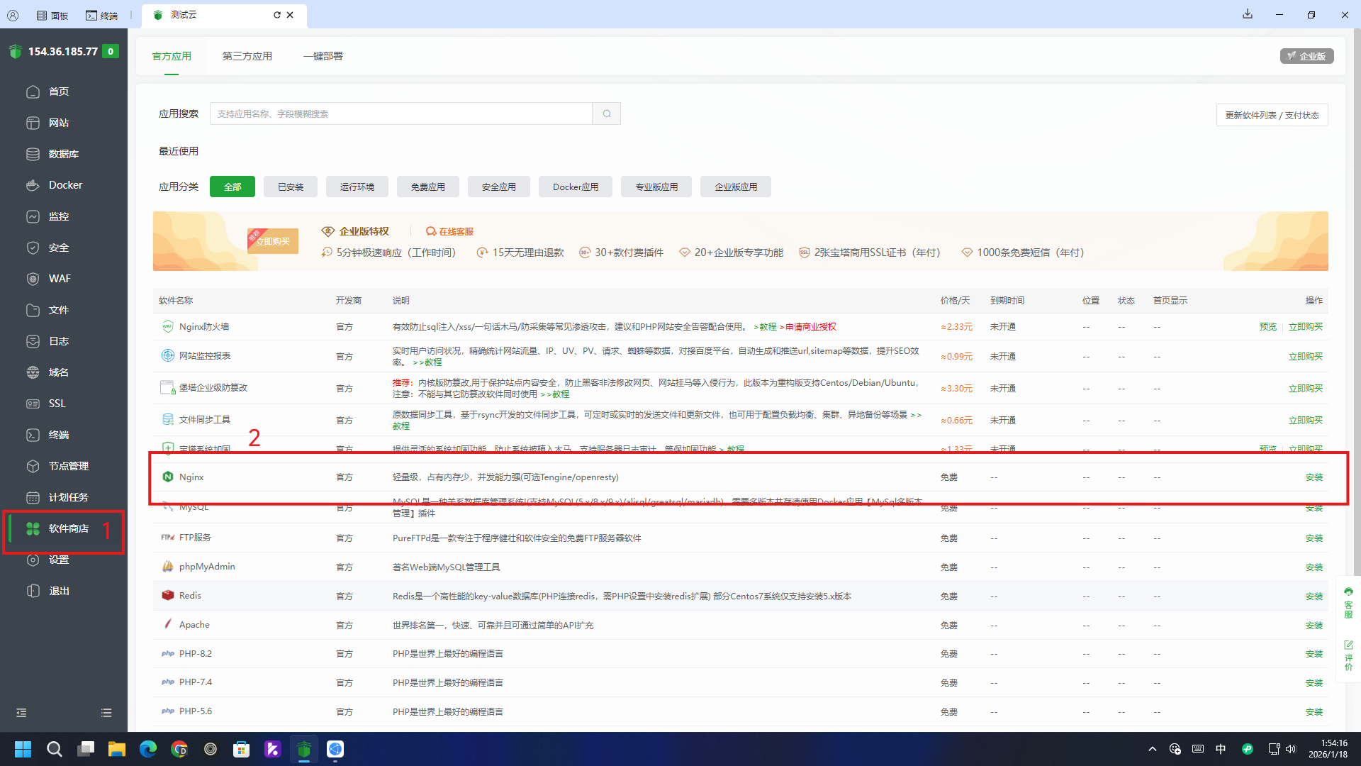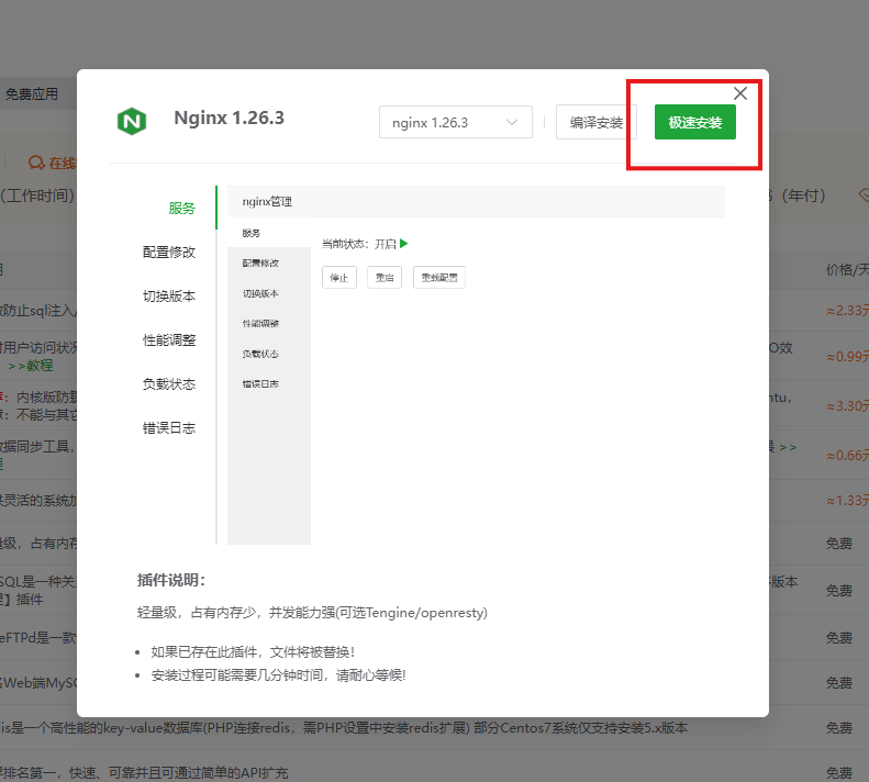 点击右侧软件商店选项,找到Nginx,点击右侧安装