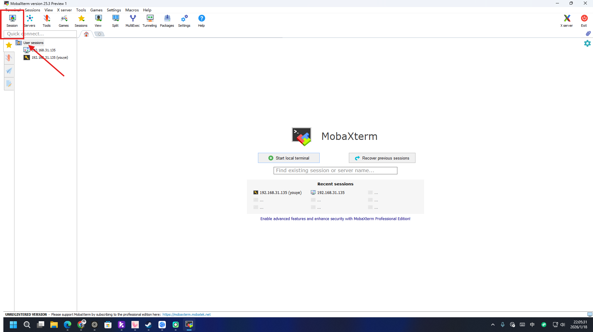 打开软件,点击右上角Session